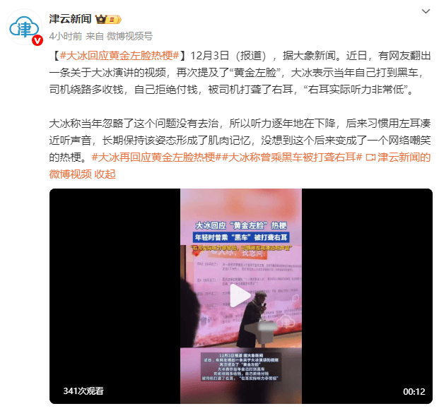 近日,有网友翻出一条关于大冰演讲的视频,再次提及了“黄金左脸”,大冰表示当年自己打到黑车,司机绕路多收钱,自己拒绝付钱,被司机打聋了右耳,“右耳实际听力非常低”。
